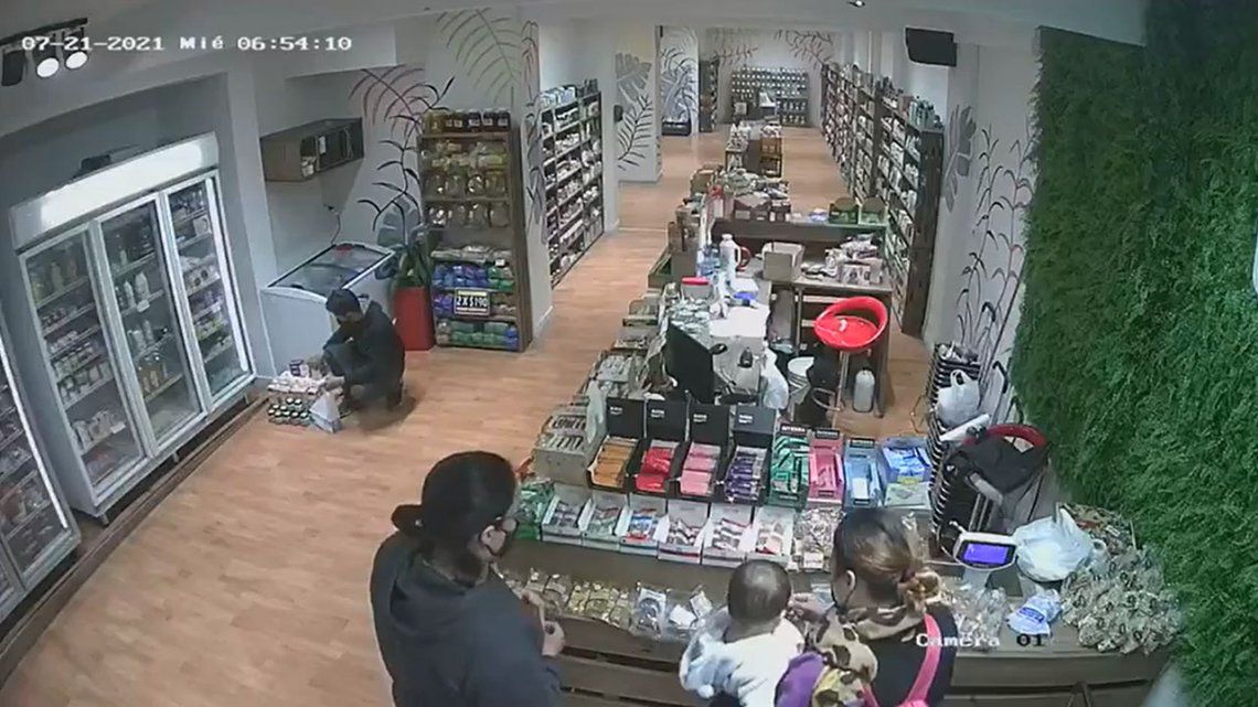 Tal como se ve en las imágenes, no se llevó nada de mercadería. Aunque parte de su plan sí fue consultar el precio de una barrita de cereal, la que utilizó como distracción para aprovechar, en pocos segundos, un descuido que culminó con el teléfono de una de las empleadas del local en su poder.